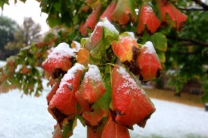 The season’s first snow is seen on brightly-colored changing leaves on Friday. (Nigel Amstock/CU Independent)