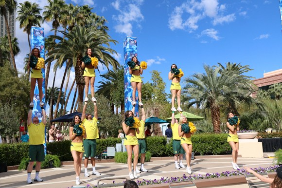 Oregon’s spirit squad faces off with Colorado at the MGM pool before the two schools’ basketball teams play each other in the second round of the Pac-12 Tournament. (Gray Bender/CU Independent)