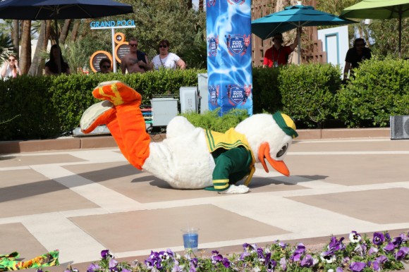 The Oregon Duck’s mascot, Puddles, does the worm during a dance compeition at the MGM Grand pool. (Gray Bender/CU Independent)