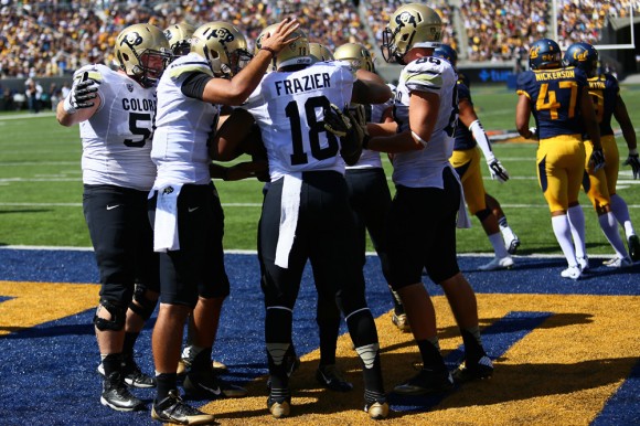 Teammates congratulate freshman full back George Frazier(18) following his touchdown run in the second quarter of play at California Memorial Stadium on Saturday. The Buffs fell to 2-3 (0-2 in Pac-12 play) after the double-overtime loss. (Nigel Amstock/CU Independent)