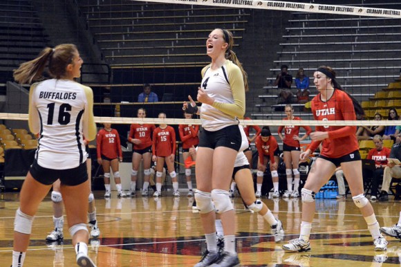 Freshman middle blocker Anna Pfefferle (4) and senior outside hitter Taylor Simpson (16) celebrate after the last point during Thursday’s win against Utah. The Buffs started out 8-1 this season, but are now 9-5 (1-1 in conference play). (Elizabeth Rodriguez/ CU Independent)