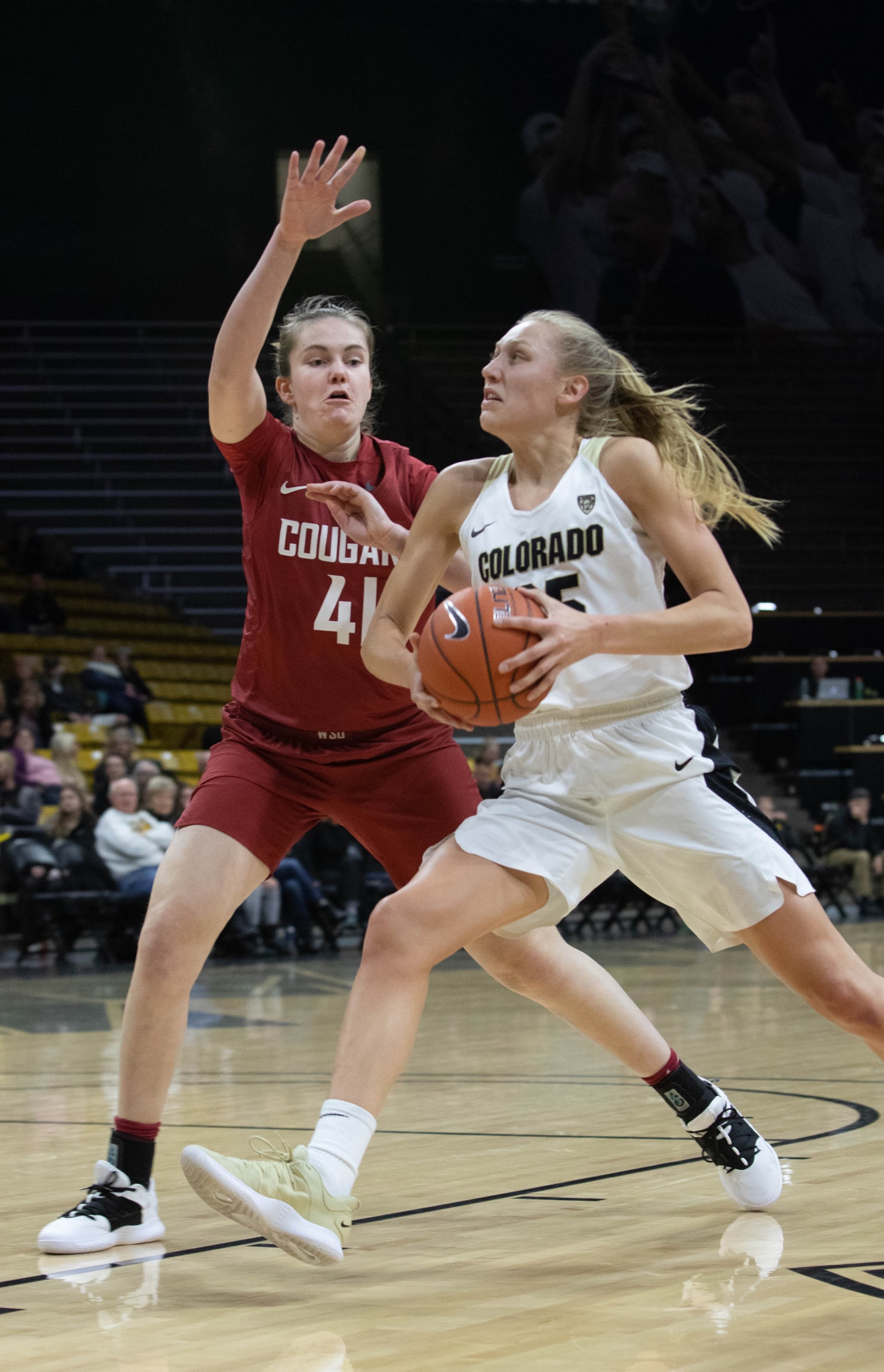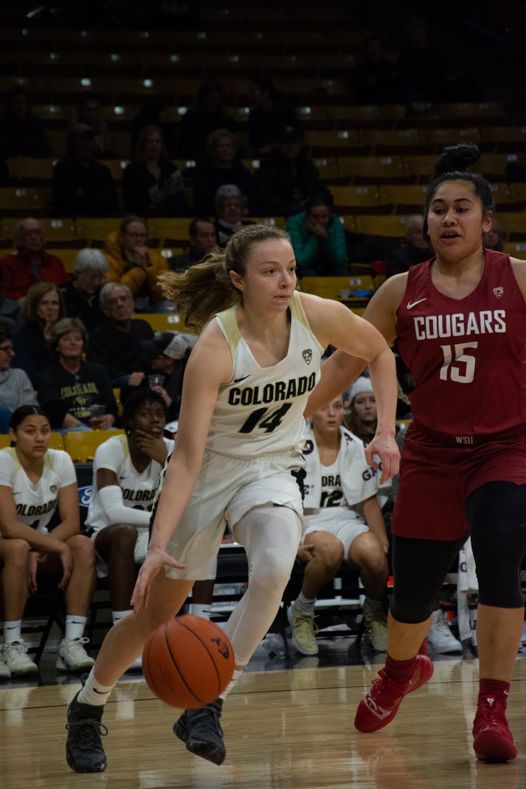 The Cougars came out of the tunnel scorching and quickly took a 7-0 lead at the 7:19 mark, forcing CU to burn an early timeout. WSU junior forward Borislava Hristova, was responsible for five of Wazzu’s first seven points, which set the tone for her big first half. Hristova had nine points, one rebound and an assist in the first half.