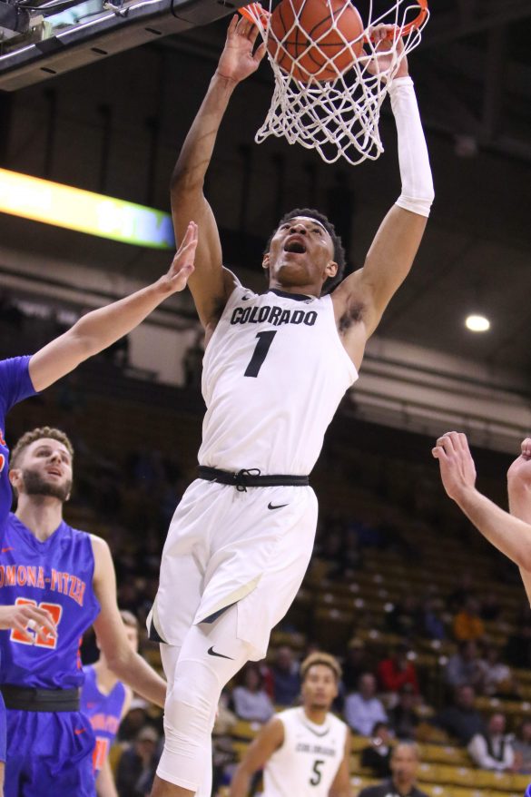 The University of Colorado Buffaloes men’s basketball team defeated the Pomona-Pitzer Sagehens, 87-56, in their first exhibition game on Saturday afternoon at the CU Events Center. The Buffaloes got off to a quick start, jumping out to a 17-4 lead just five minutes into game thanks in part to transition baskets and tough defense.