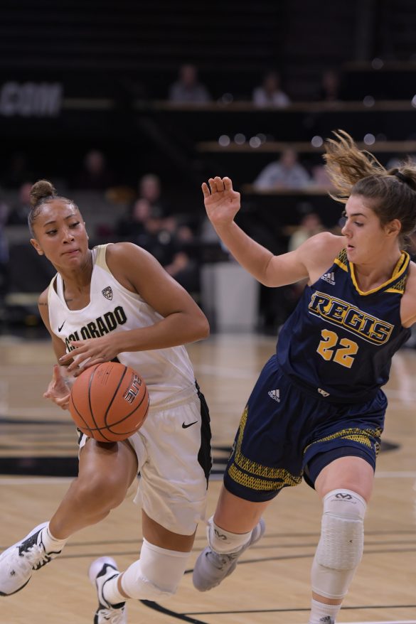 Jaylyn Sherrod charges through Regis University defense at Coors Event Center. Nov. 4, 2019. (Vyla Carter/ CU Independent).