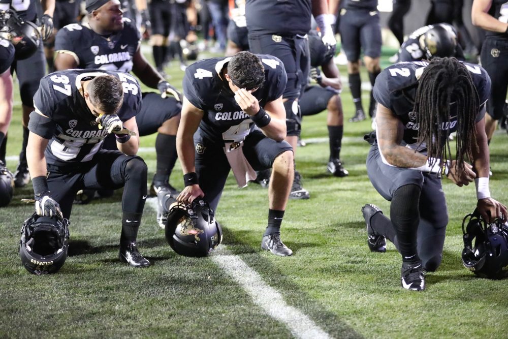 Members of the Buffs say a prayer prior to kickoff at Folsom Field. Oct. 25, 2019 (Nigel Amstock/CU Independent)