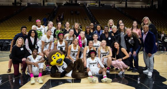 The CU women’s basketball team poses for the camera with one of the alumni teams from the ’90s. Feb. 14, 2020. (Casey Paul/CU Independent)