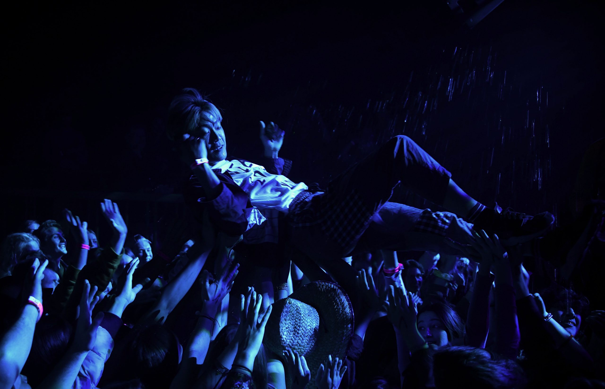 Summer Salt drummer Eugene Chung crowd surfs during the group’s finale at the Fox Theatre. March 13, 2020. (Benny Titelbaum/CU Independent)