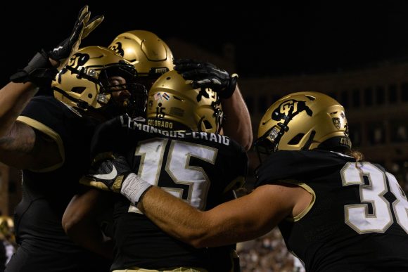 The Buffs celebrate with freshman wide receiver Montana Lemonious-Craig after Lemonious-Craig scored a touchdown during the second quarter on Sept. 3, 2021. (Kara Wagenknecht/CU Independent)