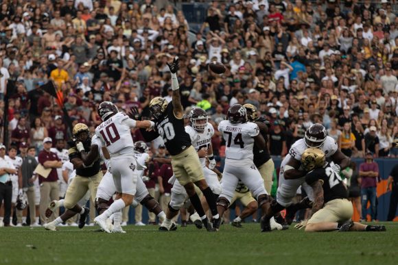 Graduate student inside linebacker Robert Barnes deflects the football on third down during the third quarter. Sept. 11, 2021. Kara Wagenknecht/CU Independent)