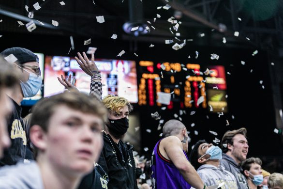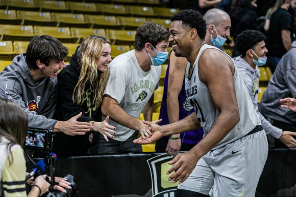 Senior forward Evan Battey (21) greets fans after winning the game against Stanford on Sunday, Nov. 28th, 2021. (Io Hartman/CU Independent)