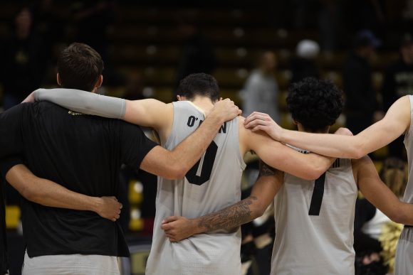 The Buffs stand shoulder-to-shoulder after the game at the CU Events Center. Dec. 1, 2022. (Kara Wagenknecht/The CU Independent)