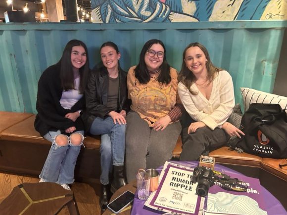 Members of the Daily He(a)rd public relations campaign for the News Literacy Project pose for a photo on Feb. 21, 2023. Left to right: Bailey Ghashghai, Halena Wetch, Oriel Voegele and Erin Bauman. (Gabbie Burton/CU Independent)