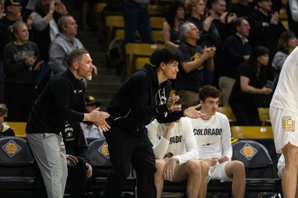 Sophomore guard KJ Simpson cheers on his teammates during the second half at the CU Events Center. March 14, 2023. (Kara Wagenknecht/CU Independent)