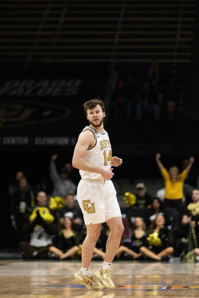 Graduate student guard Ethan Wright reacts after hitting a three-pointer during the first half against Seton Hall in the NIT Tournament opener at the CU Events Center. March 14, 2023. (Kara Wagenknecht/CU Independent)