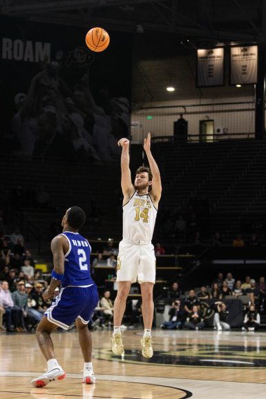 Graduate student guard Ethan Wright goes up for a shot during the first half. Wright had a career-high of 18 points against Seton Hall at the CU Events Center. March 14, 2023. (Kara Wagenknecht/CU Independent)