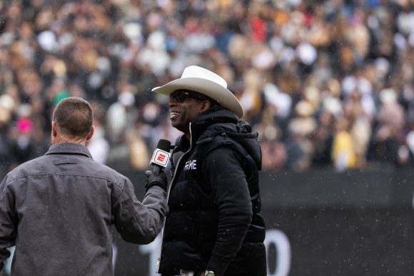 Head coach Deion Sanders gets interviewed during the game for ESPN. The Buffaloes spring game was the only school to be broadcasted on ESPN. April 22, 2023. (Kara Wagenknecht/CU Independent)