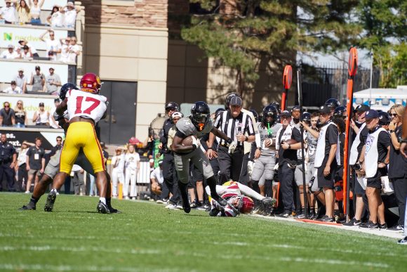 CU Boulder freshman wide receiver Omarion Miller catches a pass and runs right past a USC defender en route to a big play at Folsom Field Saturday, Sept. 30, 2023. (Rachel Glazer/CU Independent)