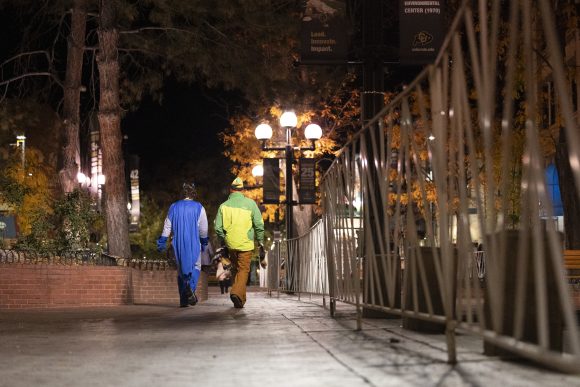A few people in costumes walk down Pearl Street Mall during the previously scheduled time for the Mall Crawl on Friday, Oct. 27, 2023. (Clementine Miller/CU Independent)