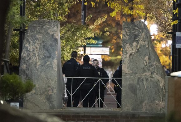 Police officers stand on Pearl Street Mall next to a barricade during the previously scheduled time for the Mall Crawl on Friday, Oct. 27, 2923. (Clementine Miller/CU Independent)