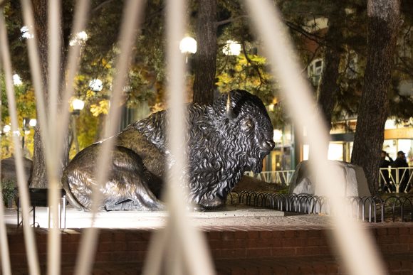 The buffalo statue on Pearl Street Mall behind the fencing that was put up in preparation for the Mall Crawl on Friday, Oct. 27, 2023. (Clementine Miller/CU Independent)
