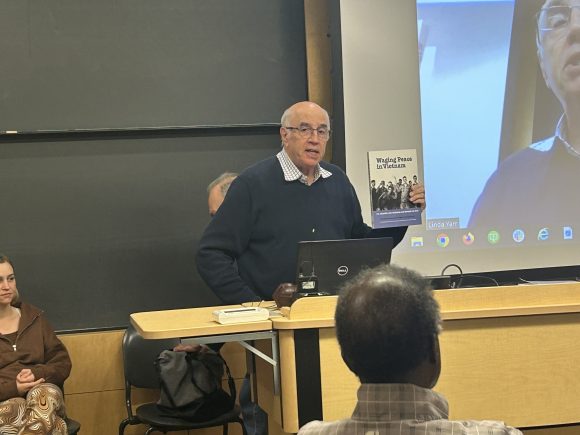 Ron Carver, curator of Waging Peace in Vietnam, displays his book at a panel in Eaton Humanities on Monday, Nov. 6, 2023. (Ann Marie Vanderveen/CU Independent)
