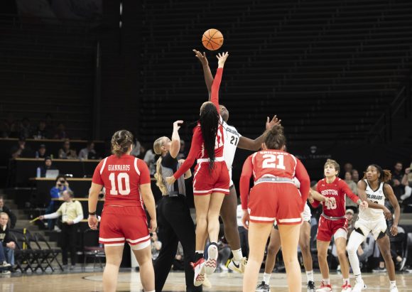 Colorado’s Aaronette Vonleh goes up against Boston’s Caitlin Weimar for the opening tip during the game on Tuesday, Nov. 28, 2023. (Susie Cormack/CU Independent)