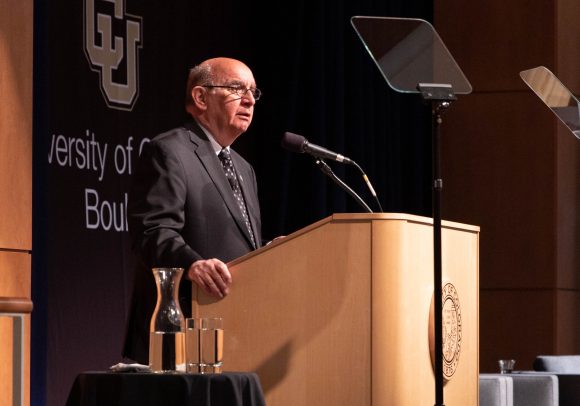 CU Boulder Chancellor Phil DiStefano speaks at his State of the Campus address. Oct. 8, 2019 (Casey Paul / CU Independent)