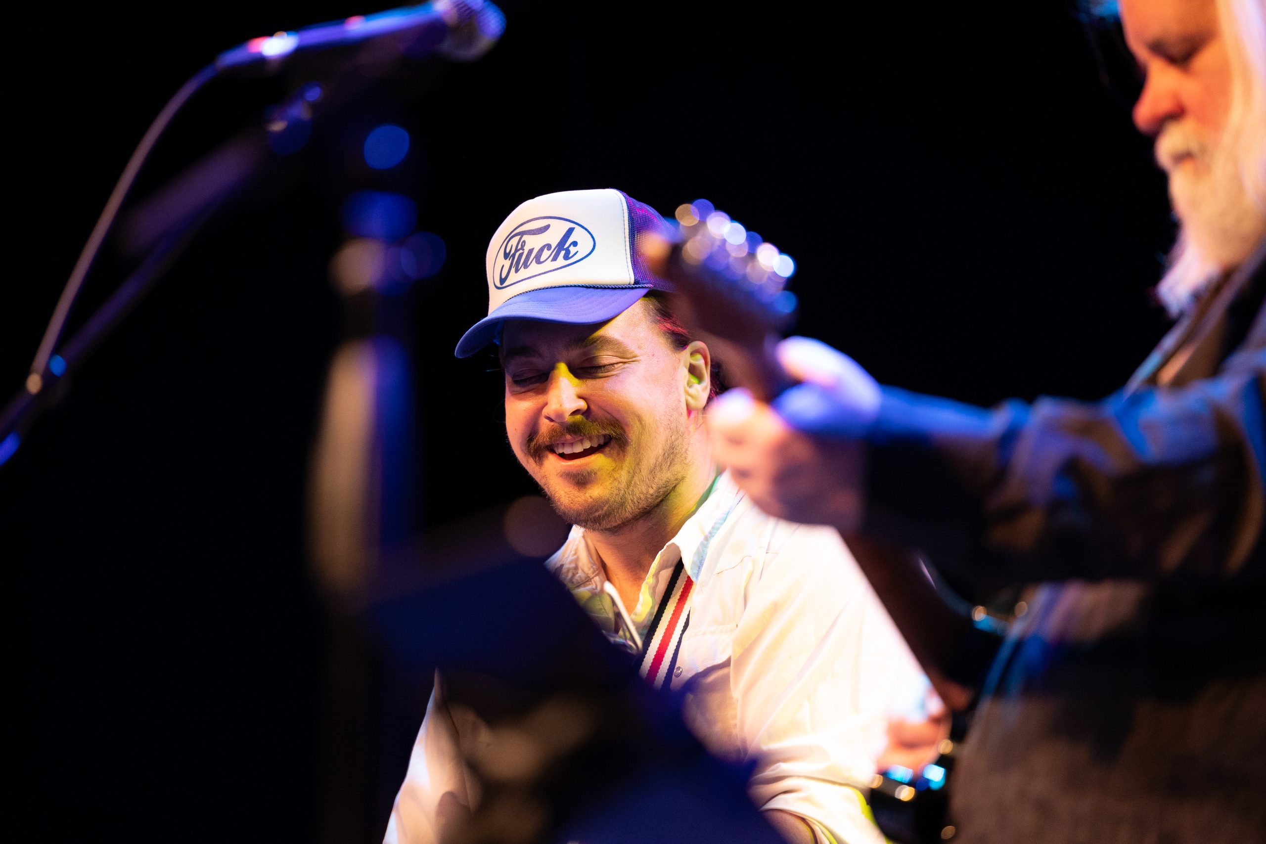 High Hawks guitarist and vocalist Adam Greuel reacts while performing during the show at the eTown Music Hall in Boulder, Colo. on Saturday, Feb. 17, 2024. (Clementine Miller/CU Independent)