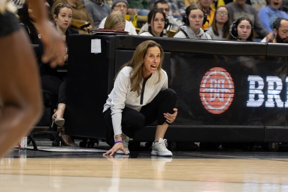 The University of Colorado’s head women’s basketball coach JR Payne instructs her team while they are defending against Oregon State University on Sunday, Feb. 11, 2024. (Clementine Miller/CU Independent)