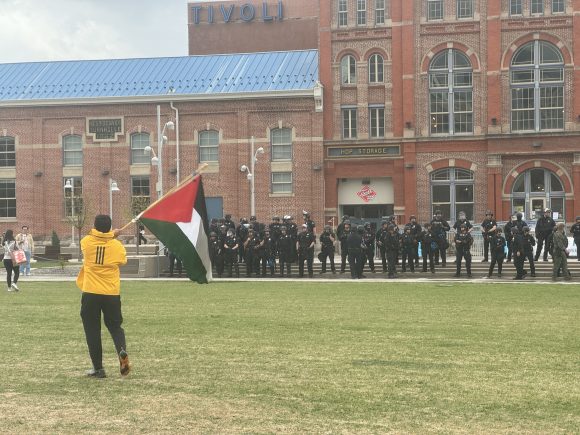 A protester waving a Palestinian flag stands in front of Denver law enforcement on Friday, April 26, 2024. (Henry Larson/CU Independent)