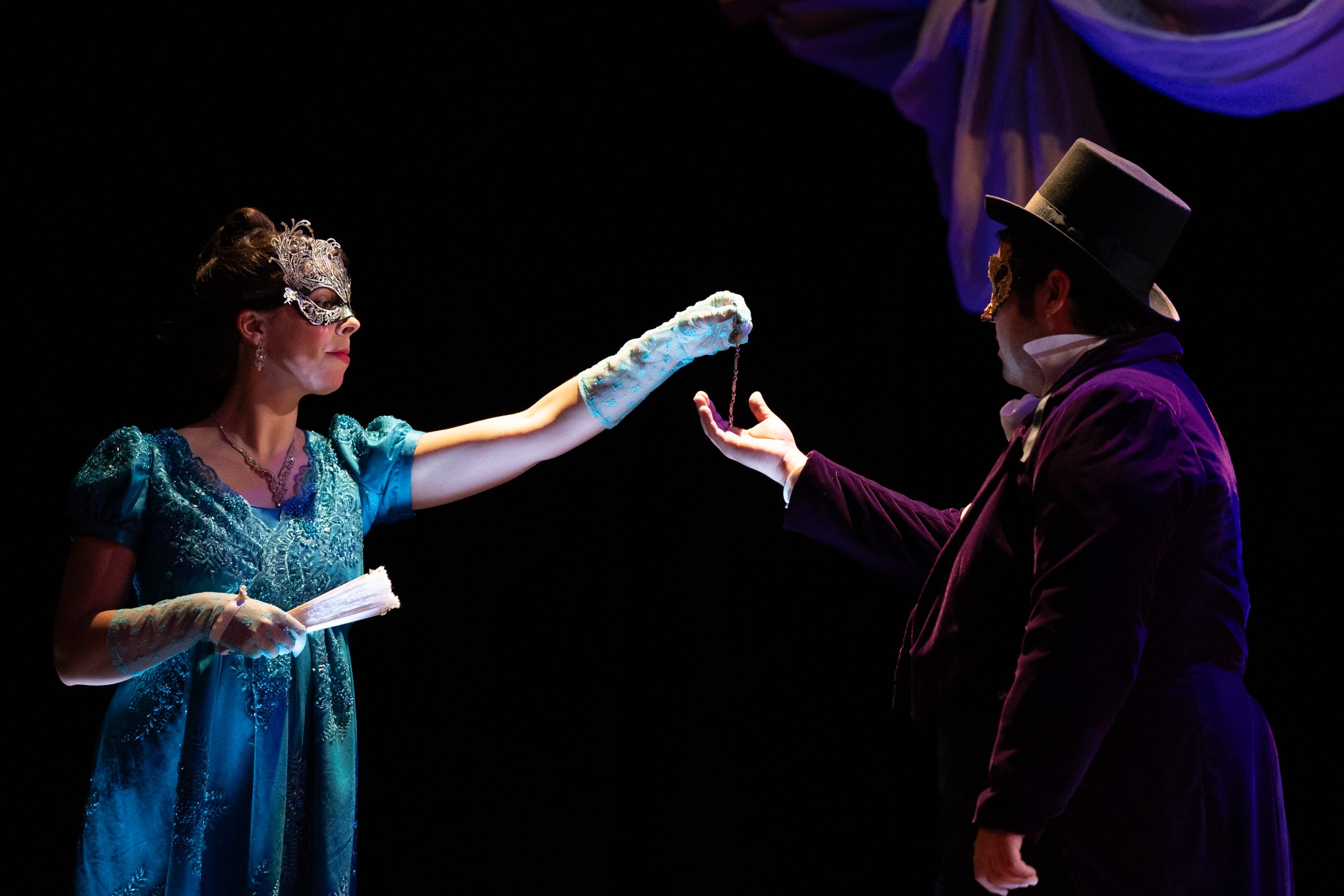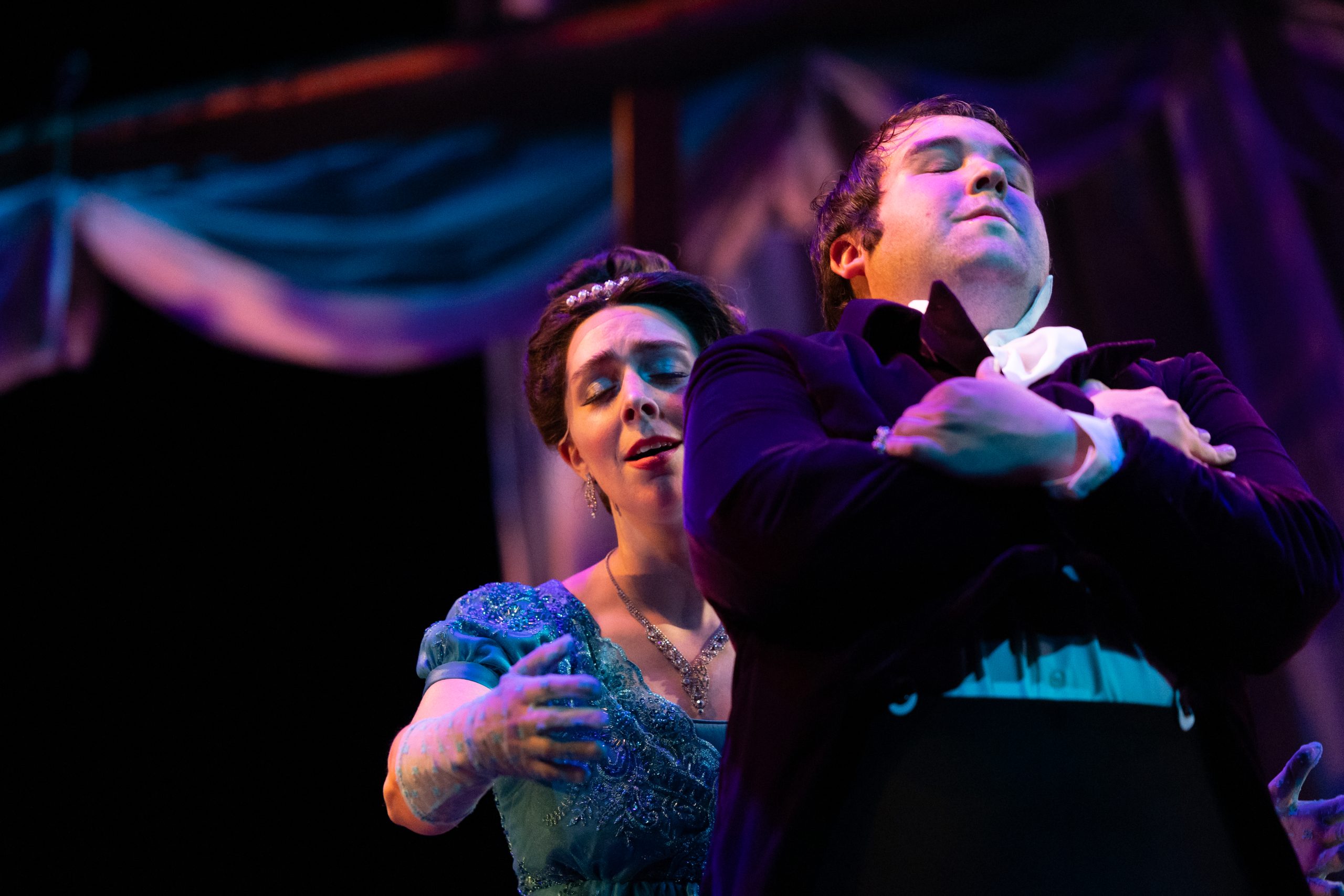 Kristina Butler playing The Lady Valerie (left) sings to Pierre Lafitte played by Max Vann during a dress rehearsal for “Cabildo” by Amy Beach for the University of Colorado Boulder’s “American Stories by American Women” performance in the Imig Music Building Music Theatre on Monday, April 22, 2024. (Clementine Miller/CU Independent)
