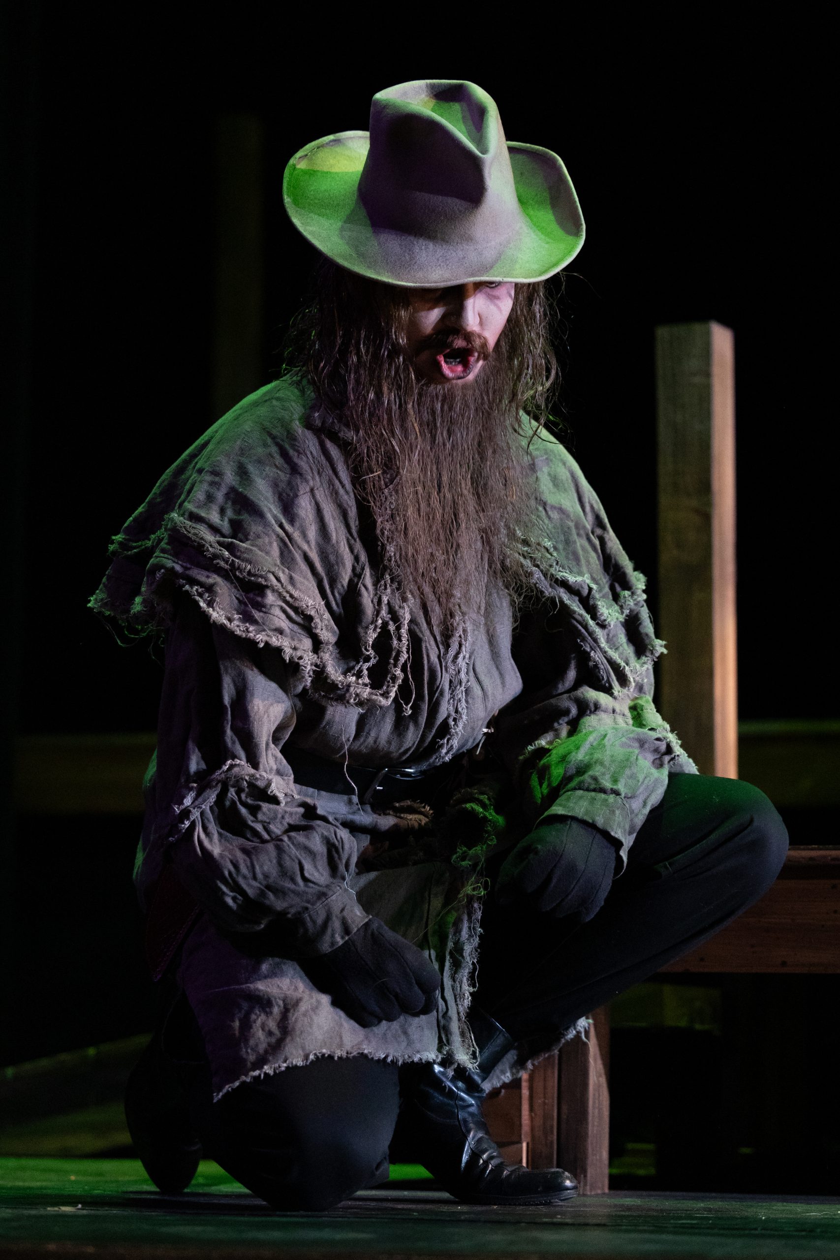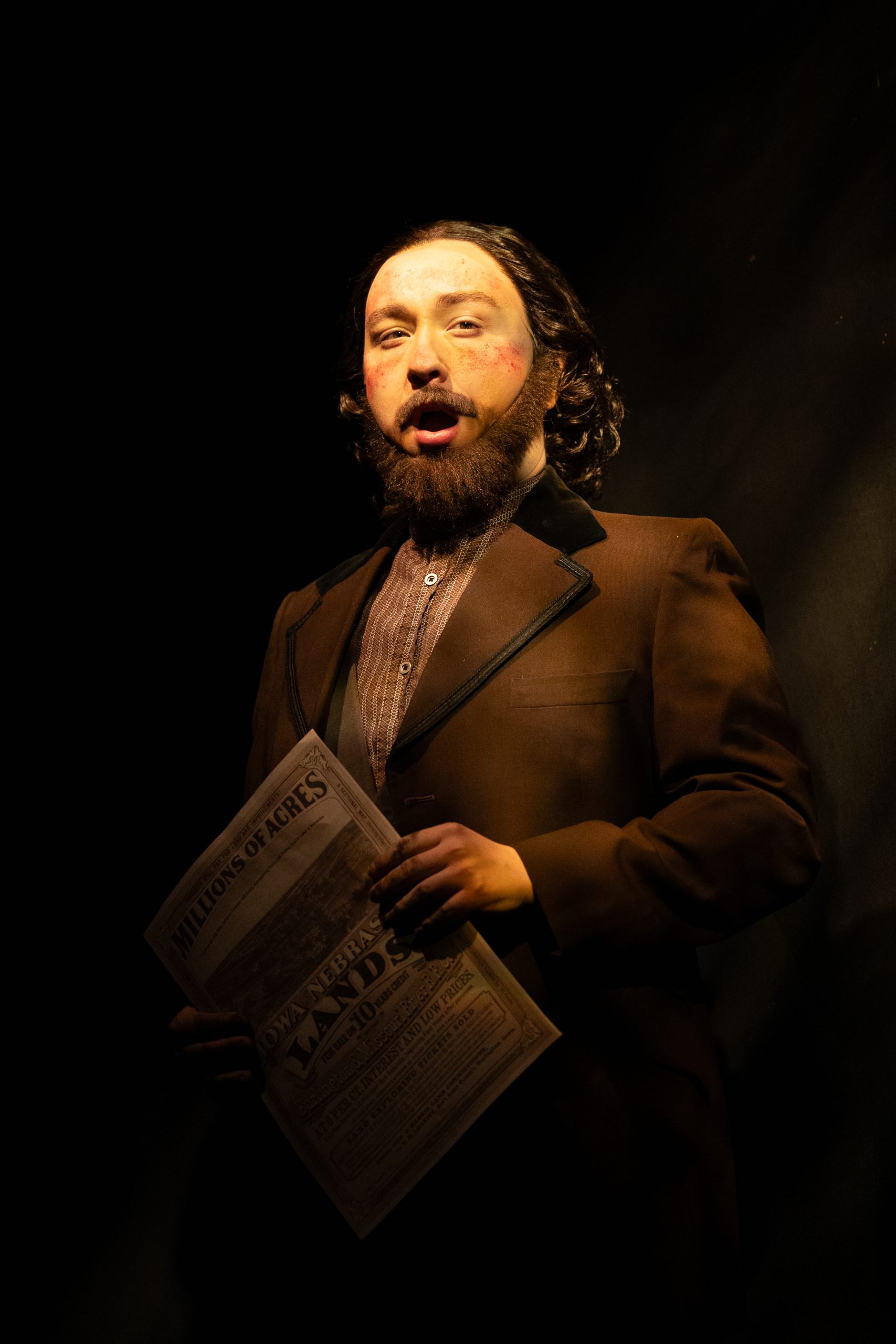 Marcus Schaller playing Sodbuster sings during a dress rehearsal of “Proving Up” by Missy Mizzoli for the University of Colorado Boulder’s “American Stories by American Women” performance in the Imig Music Building Music Theatre on Monday, April 22, 2024. (Clementine Miller/CU Independent)