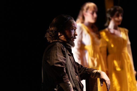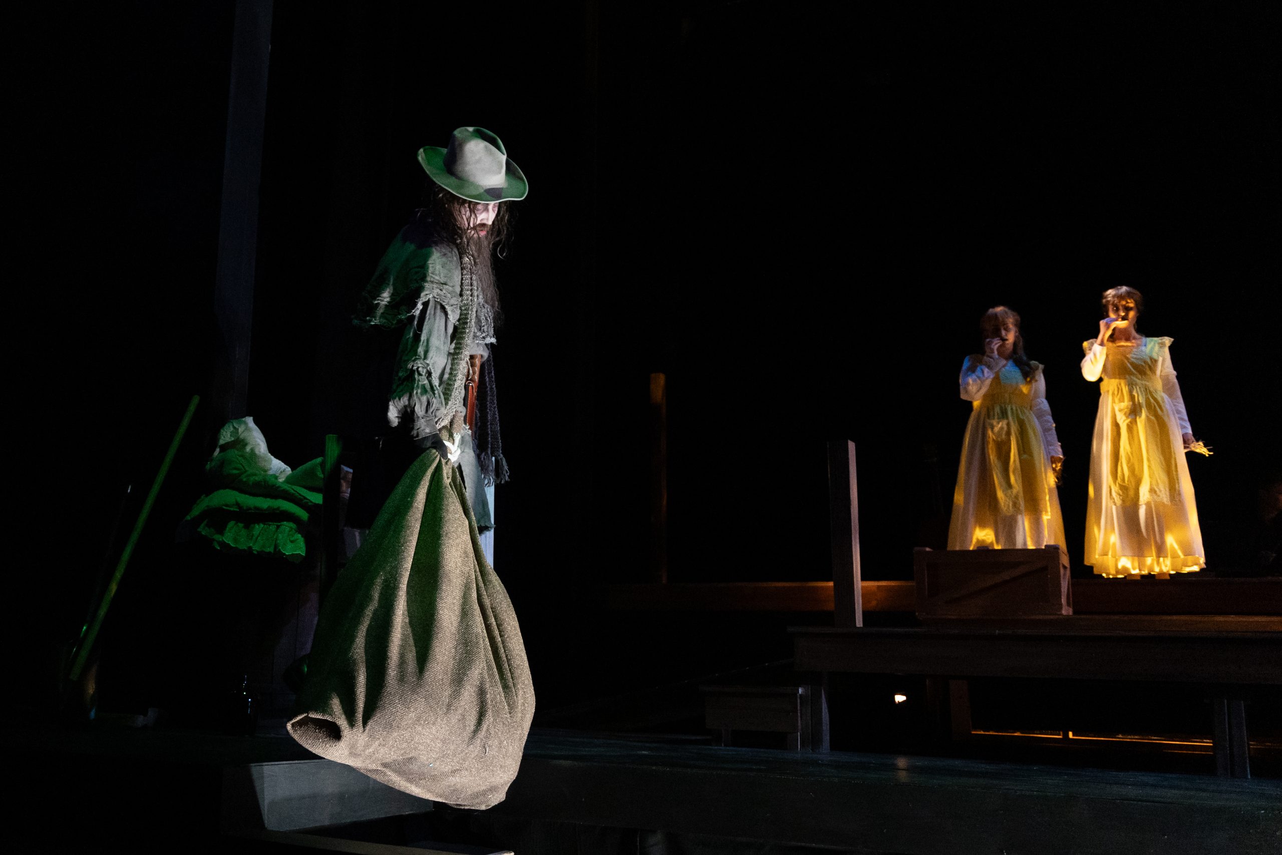 Marcus Schaller playing Sodbuster visits the Zener house during a dress rehearsal of “Proving Up” by Missy Mizzoli for the University of Colorado Boulder’s “American Stories” by American Women performances in the Imig Music Building Music Theatre on Monday, April 22, 2024. (Clementine Miller/CU Independent)