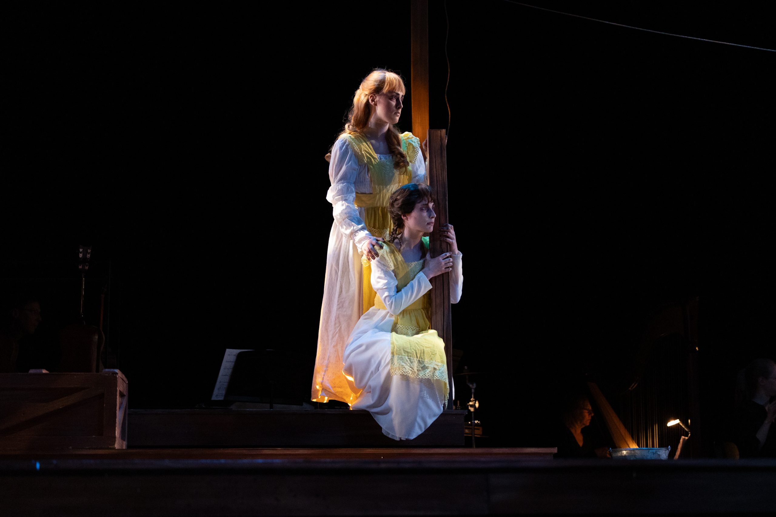 Alleigh Watson playing Taller Daughter (standing) and Sidney Grimm playing Littler Daughter perform during a dress rehearsal of “Proving Up” by Missy Mizzoli for the University of Colorado Boulder’s “American Stories by American Women” performance in the Imig Music Building Music Theatre on Monday, April 22, 2024. (Clementine Miller/CU Independent)