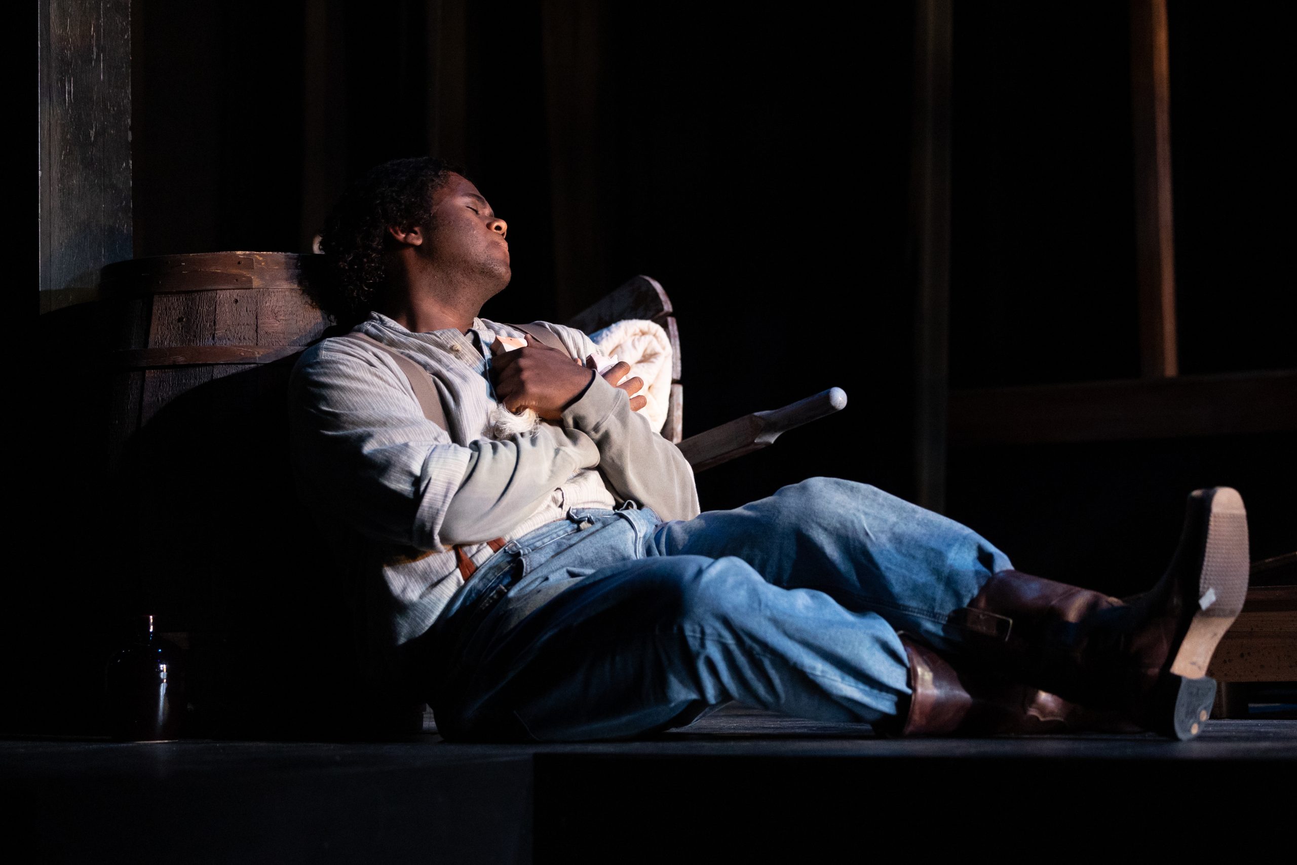 Simeon Wallace playing Miles sleeps during a dress rehearsal of “Proving Up” by Missy Mizzoli for the University of Colorado Boulder’s “American Stories by American Women” performance in the Imig Music Building Music Theatre on Monday, April 22, 2024. (Clementine Miller/CU Independent)