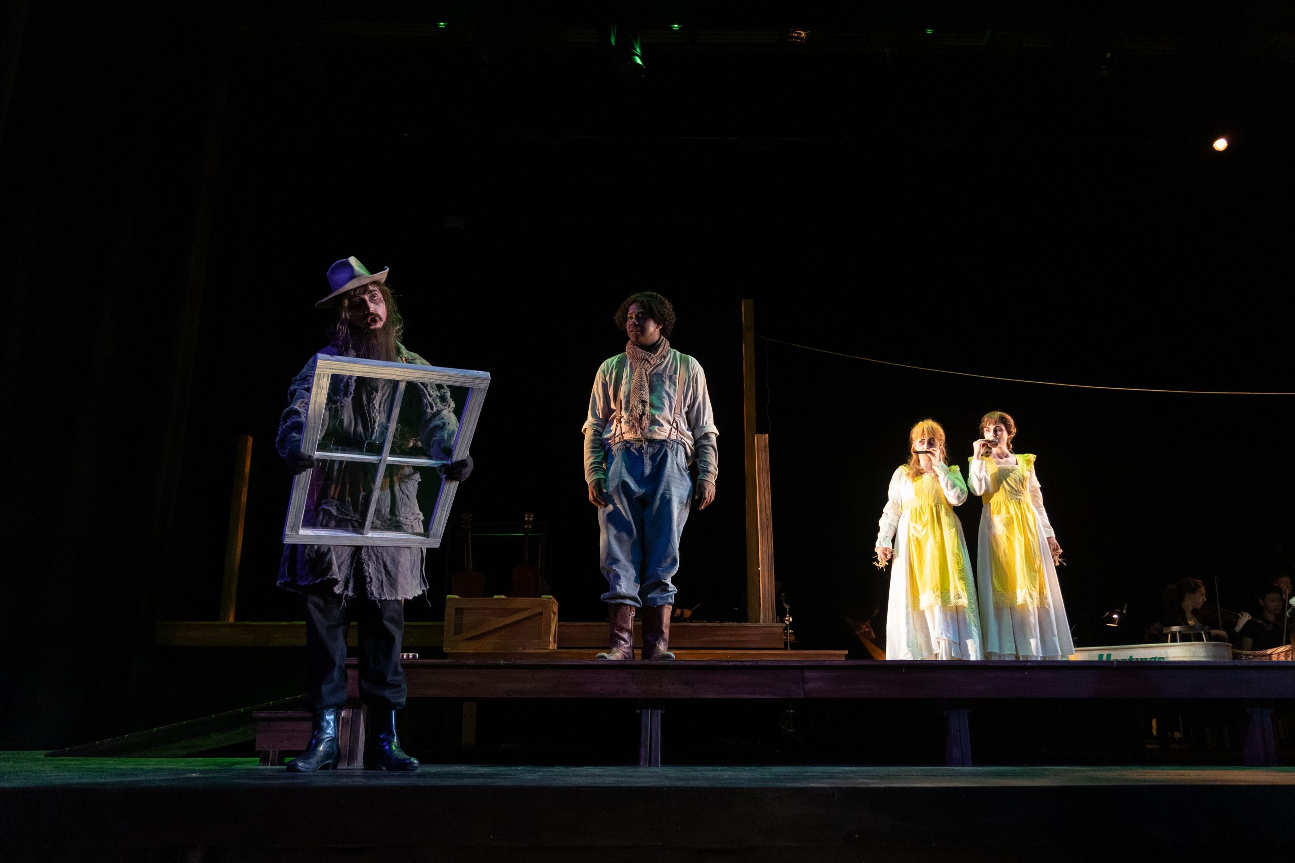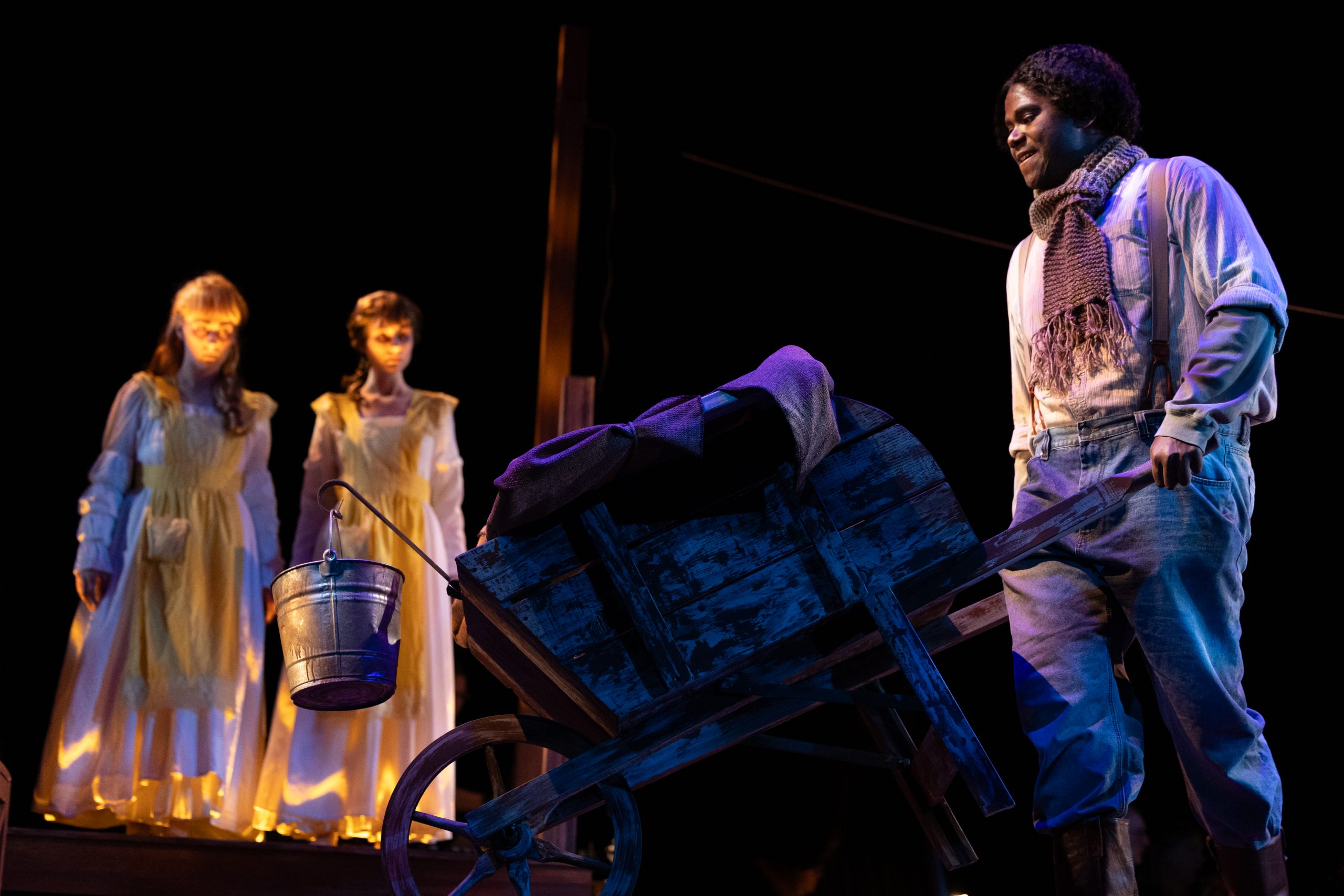 Simeon Wallace playing Miles pushes a wheelbarrow while his ghostly sisters watch in the background during a dress rehearsal of “Proving Up” by Missy Mizzoli for the University of Colorado Boulder’s “American Stories by American Women” performance in the Imig Music Building Music Theatre on Monday, April 22, 2024. (Clementine Miller/CU Independent)