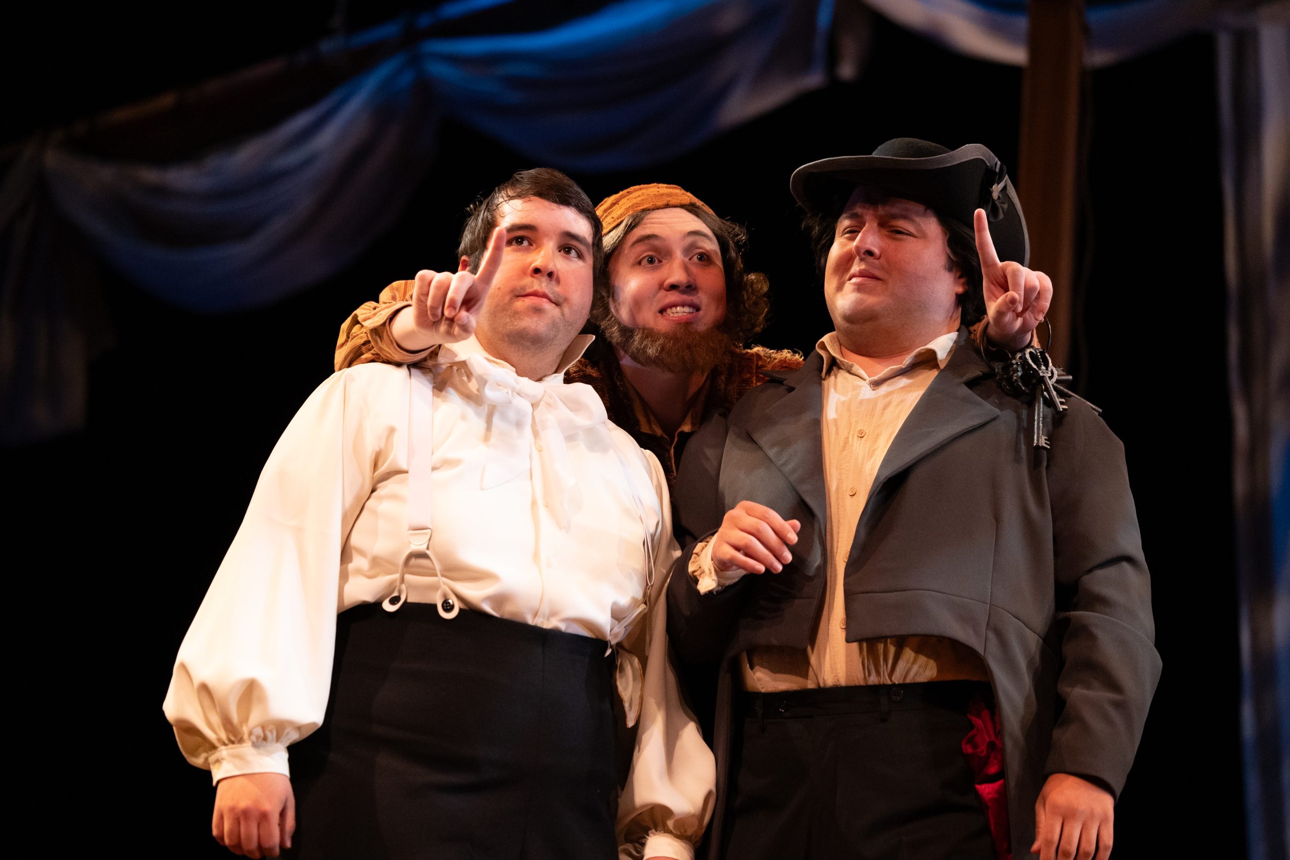 Marcus Schaller playing Jaoler (center) sings to Pierre Lafitte, played by Max Vann (left), and Dominique, played by Miguel A. Ortega Bañales during a dress rehearsal for “Cabildo” by Amy Beach for the University of Colorado Boulder’s “American Stories by American Women” performance in the Imig Music Building Music Theatre on Monday, April 22, 2024. (Clementine Miller/CU Independent)