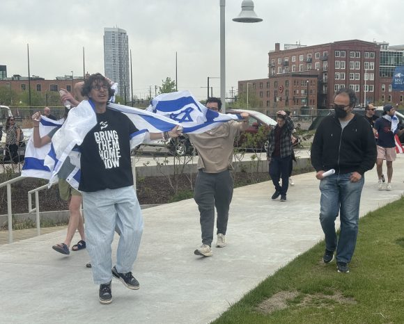 About an hour into the encampment’s Friday rally, about a dozen pro-Israel demonstrators arrived. They walked several laps around the encampment while singing songs in Hebrew. Some of those counterprotesters shouted “There is no Palestine” or yelled through bullhorns at those in the camp.