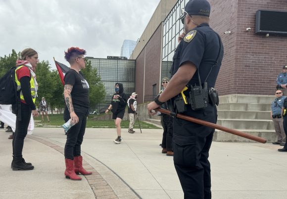 Within minutes of counterprotesters arriving, officers from at least four separate law enforcement agencies descended on the scene. The 20-some officers wore patches from the Auraria Campus police, Colorado State Patrol, Denver police and the Colorado Rangers — an auxiliary police force in the state. It was the largest number of visible law enforcement near the encampment since 40 protesters were arrested on April 26.