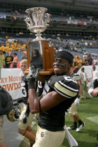 Sophomore denfensive back Ayodeji Olatoye walks off the field holding CU's trophy following the CU-CSU game at Sports Authority Field (Mile High Stadium) in Denver, which CU won 28-14. (CU Independent/Amy Leder)