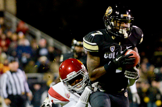 Toney Clemons catches a long third down pass from Tyler Hansen in the 3rd quarter of the CU USC Blackout game Friday night at Folsom field. The Buffs lost 42-17 (CU Independent/Andrew Kaczmarek)