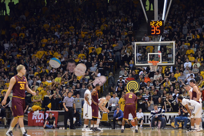 Arizona State’s Chris Colvin attempts a free throw on Jan. 19 in front of the C Unit student section in this file photo. The CU fans had crafted signs to distract Sun Devils at the free throw line. (CU Independent File/Annie Rumbles)