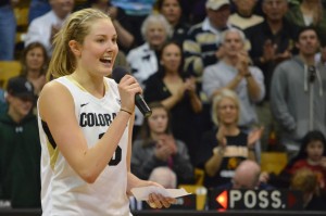 The sole senior Buff, Julie Seabrook, speaks after the game on Saturday night at the Coors Event Center. Seabrook finished her at-home college career with 11 points and 10 rebounds during a 67-57 win over Oregon State. (CU Independent/Annie Rumbles)
