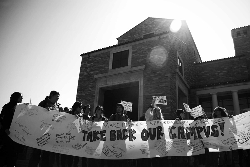 Students in the Take Back Our Campus movement gather in front of the UMC to protest tuition increases and a lack of diversity on campus in March 2012. (CU Independent/James Bradbury)