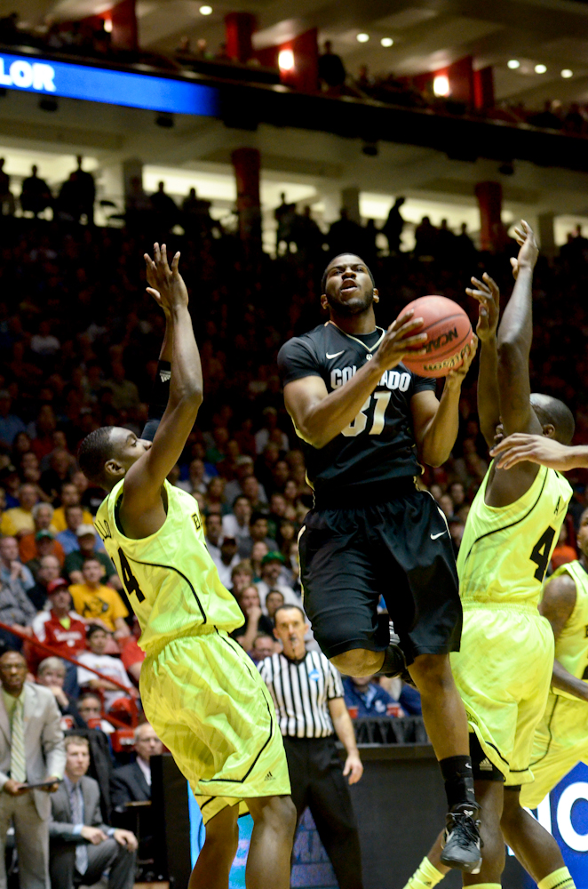 Jeremy Adams drove the lane against Baylor defenders, and made the layup. The Buffs trail Baylor at half time 35-37 at the Pit in Albuquerque, NM. (CU Independent/Andrew Kaczmarek)