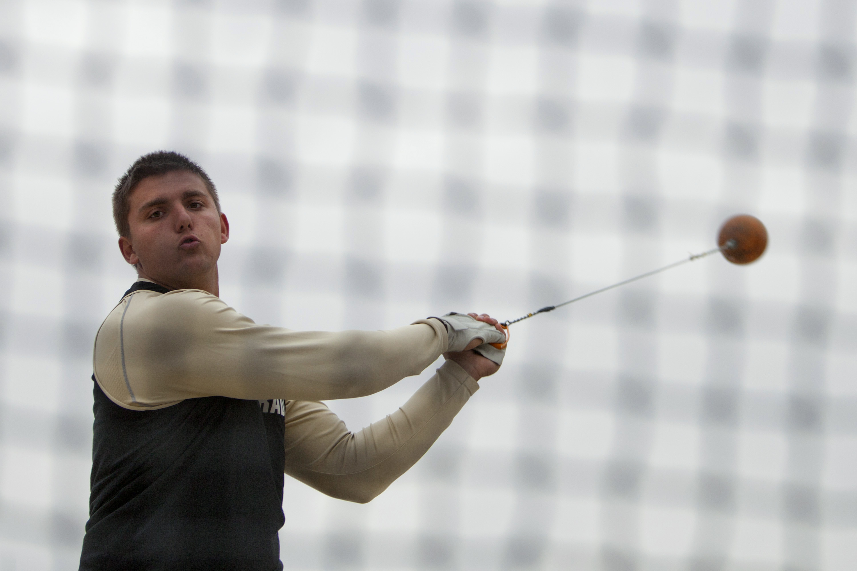 Sophomore thrower Alexandre Kizirian swings the hammer at the Friday, April 13, 2012 CU Invitational at Potts Field. Kizirian came in second with a throw of 57.04 meters. (CU Independent/Robert R. Denton)