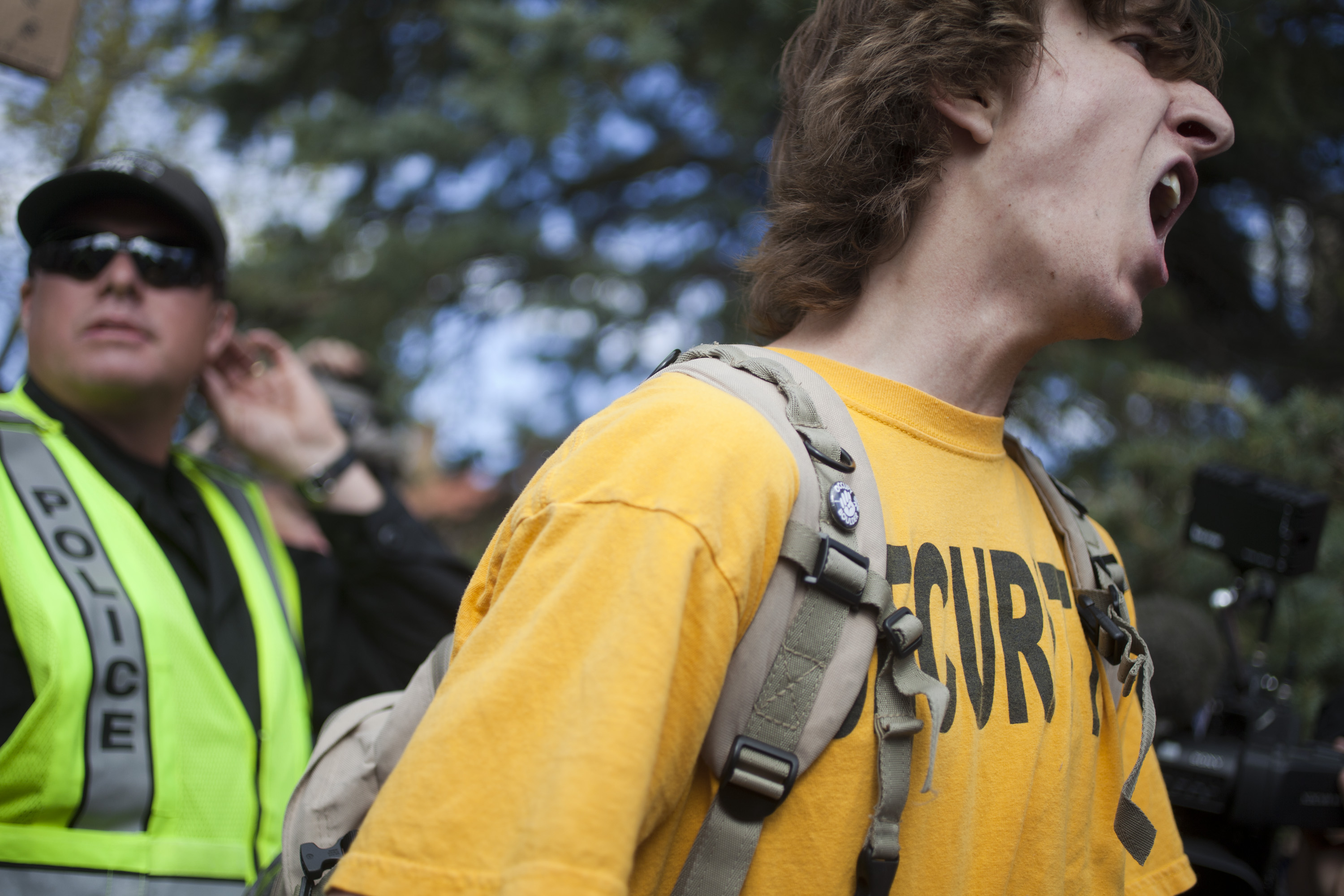 Sophomore physics major Daniel Ellis Schwartz leads the crowd in chants near Norlin Quad. The protesters decided to move to the Duane Physics field shortly after. (CU Independent/Robert R. Denton)