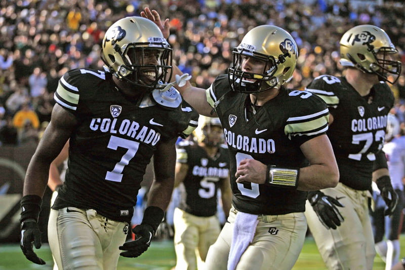 Graduated wide receiver Toney Clemons is congratulated by quarterback Tyler Hansen after scoring a touchdown in the third quarter of the November 12, 2011, Senior Day, win over Arizona. Clemons was drafted by the Steelers in the seventh round and Hansen was picked up by the Bengals as a free agent. (CU Independent File/James Bradbury)