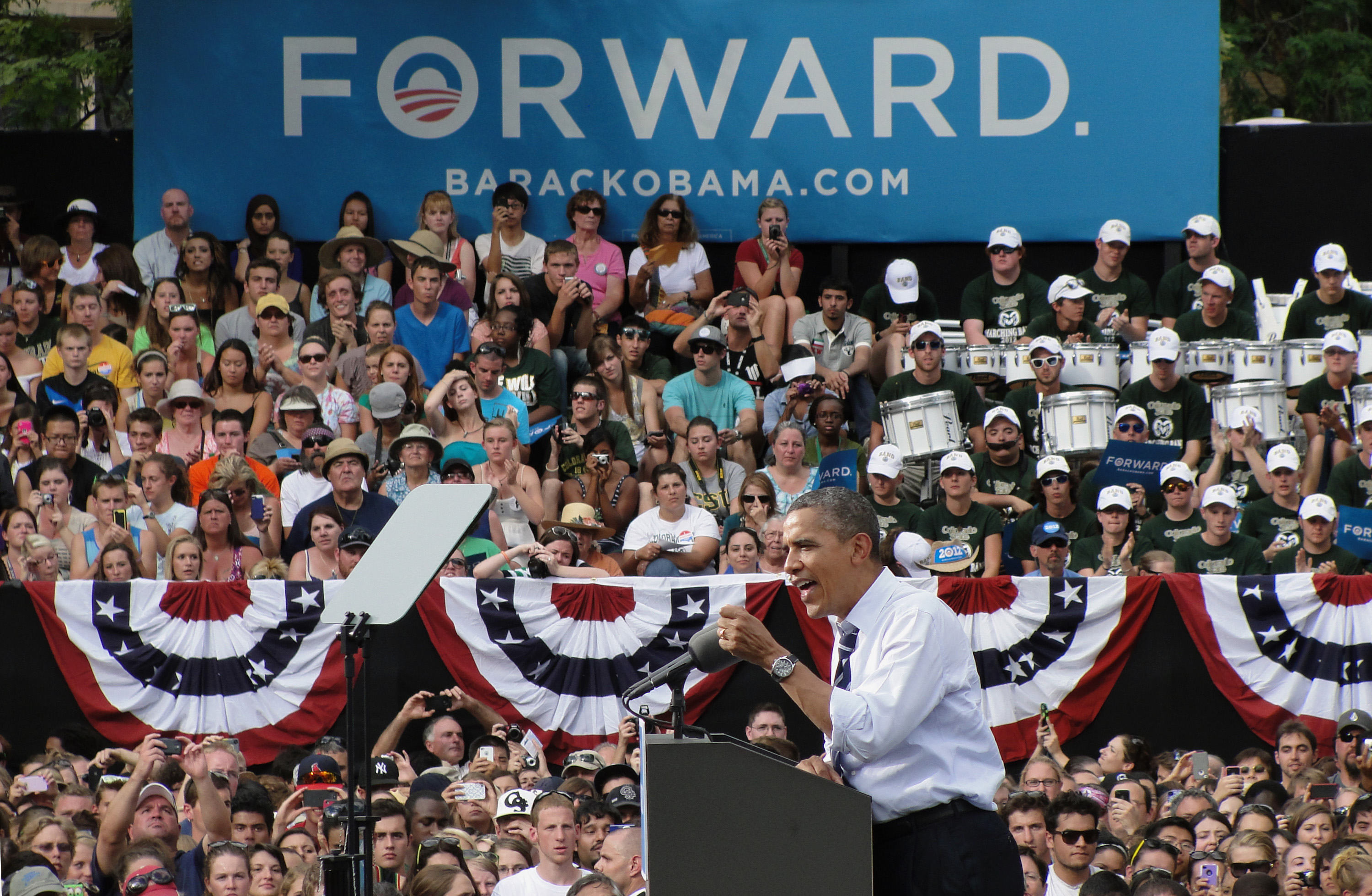 The president made remarks to a crowd of about 13,000 people on the CSU campus Tuesday evening. The main focus of his speech was on the importance of registering as many voters as possibe as Colorado will be decisive in this year’s election. (CU Independent/Alison Noon)