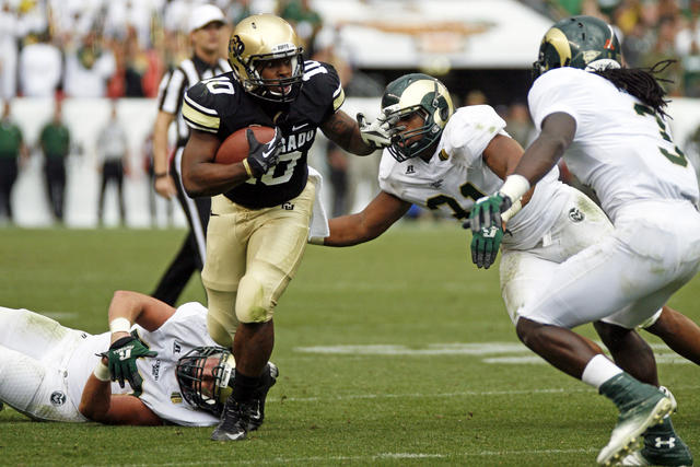 Sophomore tailback Malcolm Creer fights for yards on Colorado’s last play in Saturday’s 17-22 loss to Colorado State. (CU Independent/James Bradbury)